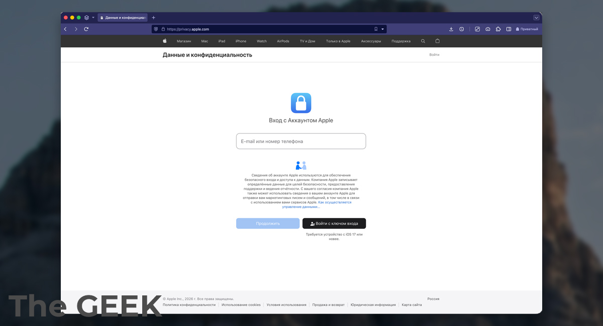 - Открыть в браузере privacy.apple.com и войти в свой Apple ID.