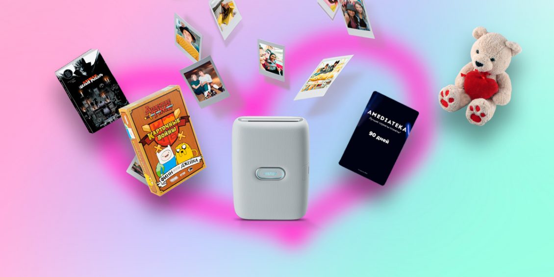 Принтер моментальной печати Instax mini Link отличный подарок на 14 февраля. Для него или для нее — совершенно не важно. У устройства лаконичный дизайн и три цветовых вариации: синий, розовый и белый. Плюсом формата принтера выступает то, что качество фотокарточек при печати на mini Link не теряется.