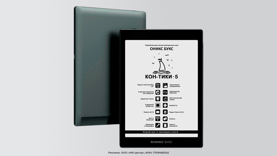 Редкий случай, когда подарок выглядит технологично и при этом сразу понятен по смыслу. ОНИКС БУКС Кон-Тики 5 — электронная книга для тех, кто читает много, долго и не хочет уставших глаз. Экран E Ink Carta Plus с плотностью 300 ppi ощущается как хорошая бумага, а подсветка без мерцания позволяет читать вечером без ощущения, что смотришь в планшет.