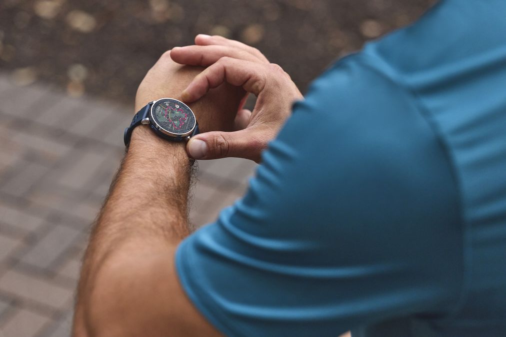Часы имеют корпус диаметром 45 мм из нержавеющей стали и оснащены четырьмя кнопками. 1,32-дюймовый AMOLED-дисплей с сапфировым стеклом обеспечивает яркость до 3000 нит.