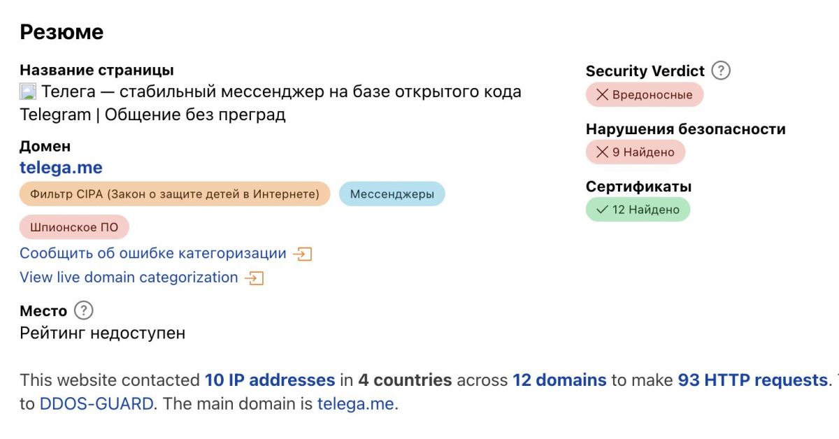 Команда The GEEK обратила внимание на исчезновение Телега из App Store и проверила связанную с проектом инфраструктуру. При проверке через Cloudflare Radar домен telega.me отображался с пометками, связанными с рисками безопасности, включая spyware (шпионское ПО) и нарушения политик безопасности.
