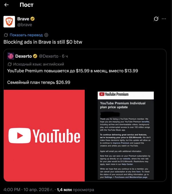 На фоне повышения цен браузер Brave решил публично поддеть YouTube. В соцсетях компания прокомментировала новость короткой фразой: блокировка рекламы в Brave всё ещё стоит ноль долларов.