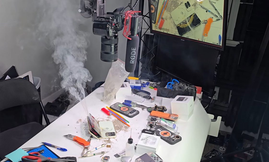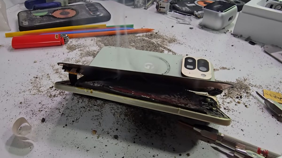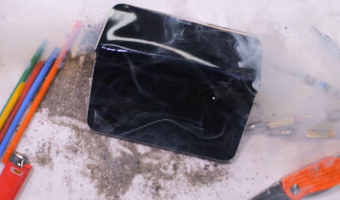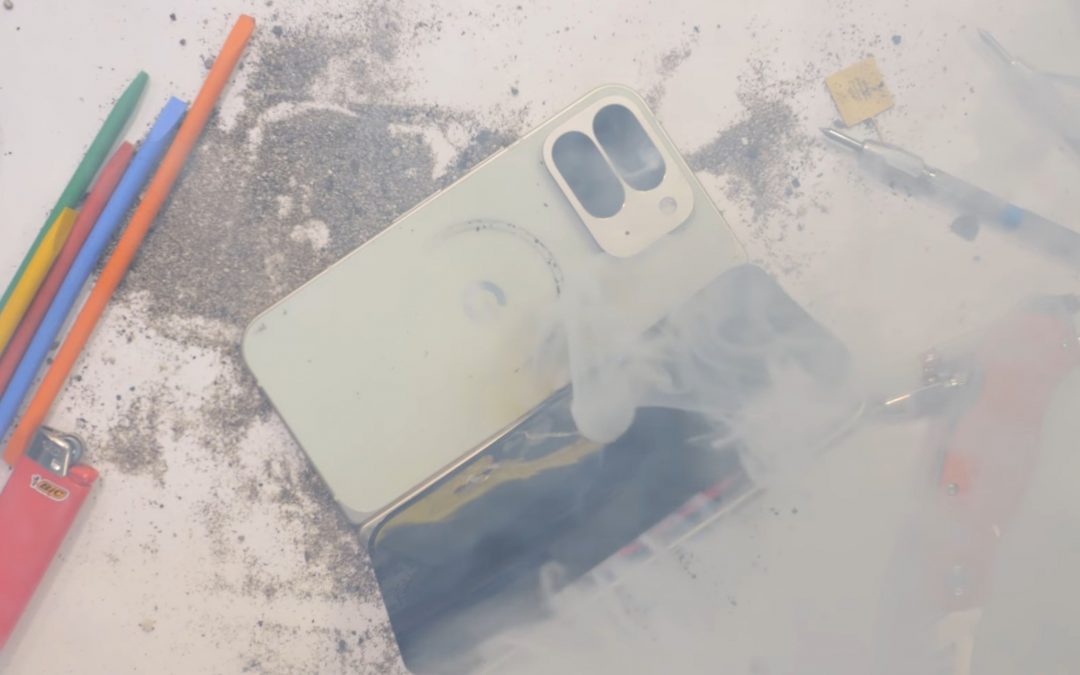 После разлома батарея внутри корпуса замкнула и воспламенилась. Смартфон задымился прямо во время съёмки. JerryRigEverything отметил, что за 10 лет тестов он впервые столкнулся с таким случаем.