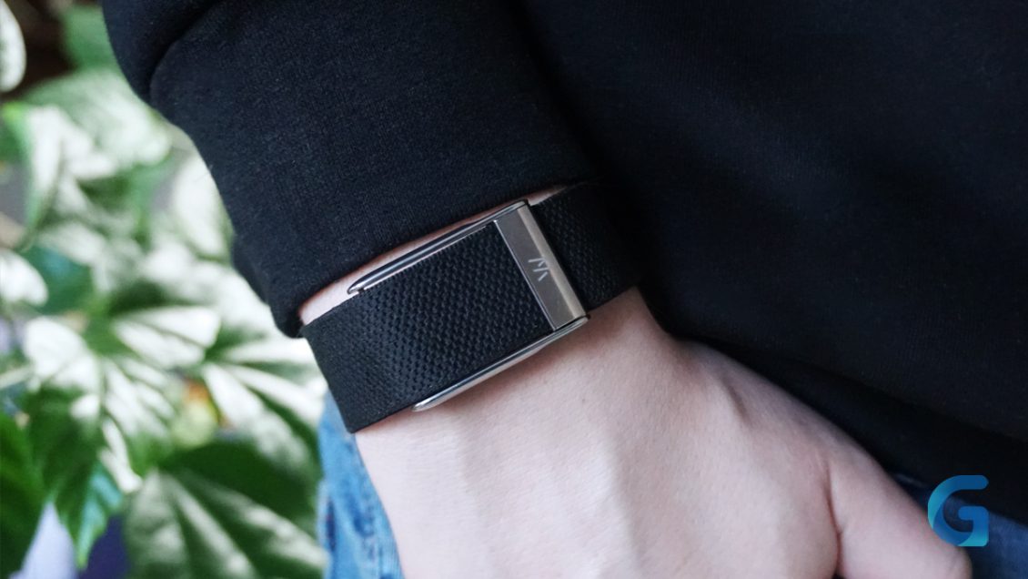 Устройство представляет собой серый тканевый браслет с оранжевой подкладкой и внешне напоминает Whoop.