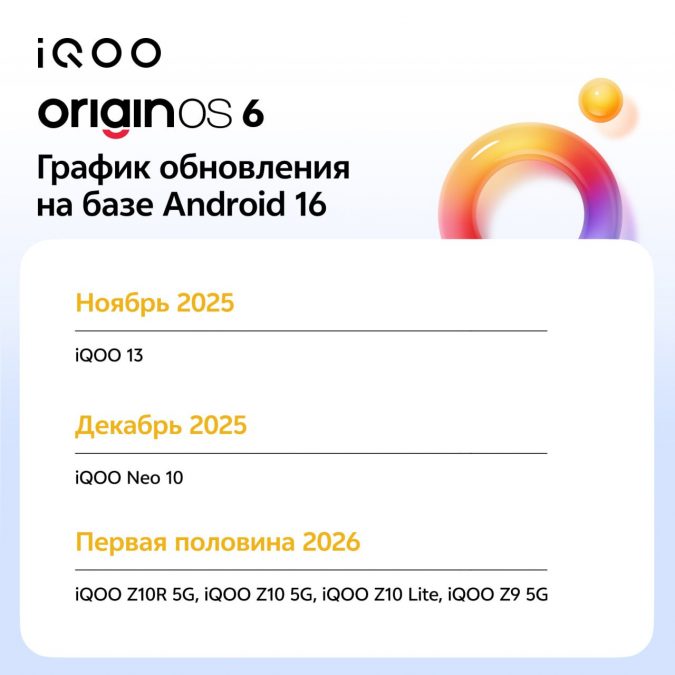 Российское подразделение iQOO опубликовало дорожную карту развертывания новой оболочки OriginOS 6 (Android 16) на Ростест-смартфонах бренда.