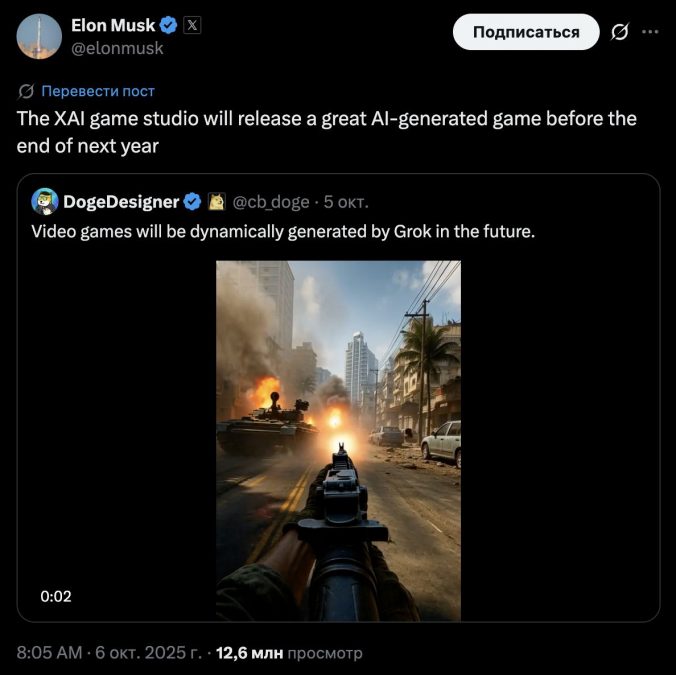 Заявление стало ответом на пост пользователя соцсети X (бывший Twitter), показавшего клип, сгенерированный моделью Grok Imagine. Маск подтвердил, что в будущем видеоигры действительно смогут динамически генерироваться нейросетью Grok.