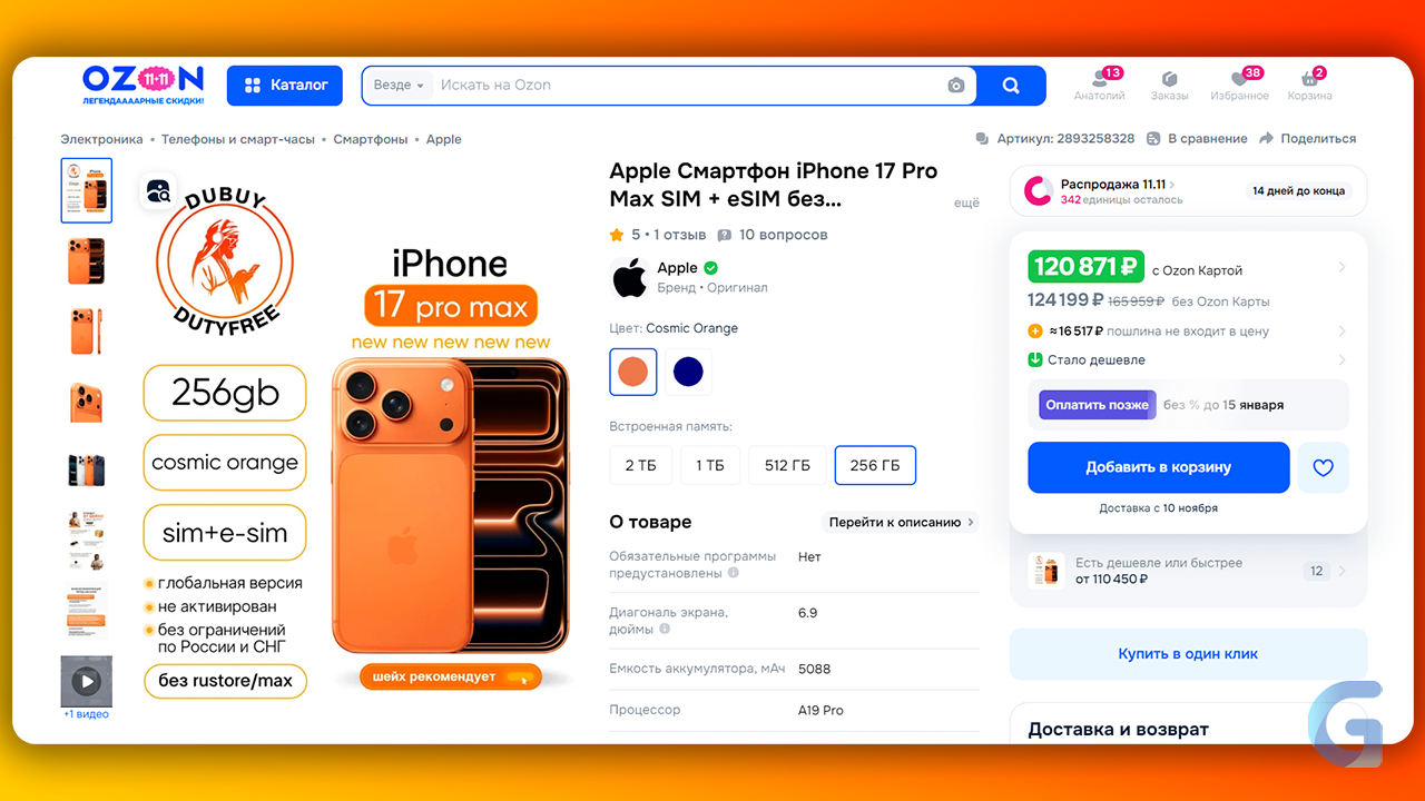 В сентябре iPhone 17 Pro с 256 ГБ памяти стоил 164 990 рублей, а iPhone 17 Pro Max — 184 990 рублей. Сейчас на маркетплейсах их можно найти значительно дешевле:
