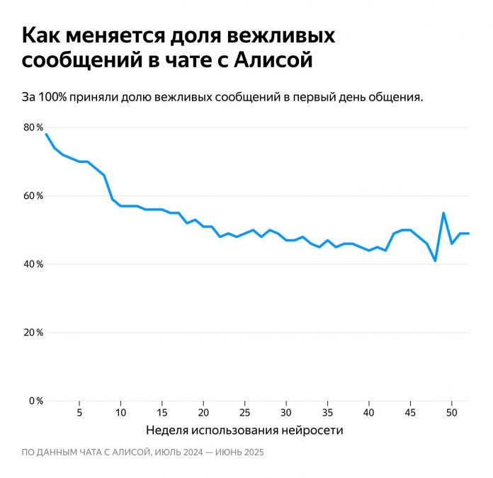 Аналитики Яндекса рассказали, насколько вежливо россияне общаются с Алисой. Оказалось, что в начале знакомства люди чаще здороваются, благодарят и прощаются, но по мере привыкания к нейросети делают это всё реже — воспринимая её не как собеседника, а как инструмент.