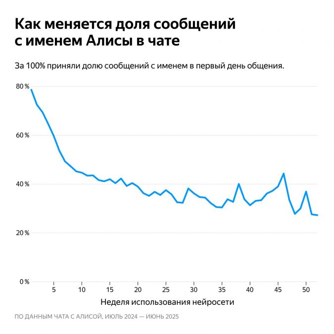 Чаще всего имя «Алиса» звучит в первый день общения — в каждом десятом сообщении. Позже пользователи сокращают обращения и сразу формулируют команды. При этом женщины на 20% чаще мужчин используют вежливые выражения и на 25% чаще обращаются к нейросети по имени.