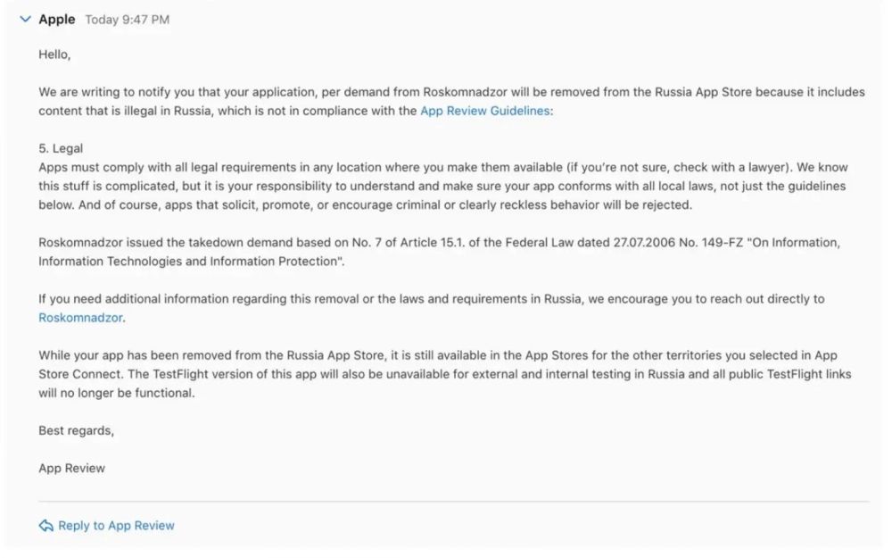 В частности, создатели одного из приложений опубликовали письмо от Apple, где уточняется, что удаление связано с «незаконным в России контентом».