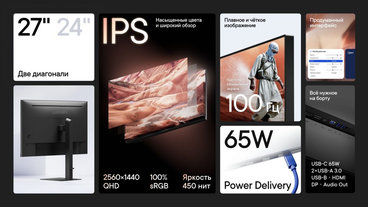 Мониторы оснащены USB-C с Power Delivery 65 Вт — ноутбук можно заряжать и выводить изображение через один кабель. Яркость заявлена на уровне 450 нит, что заметно выше типичных офисных значений и помогает сохранять читаемость даже при ярком свете.