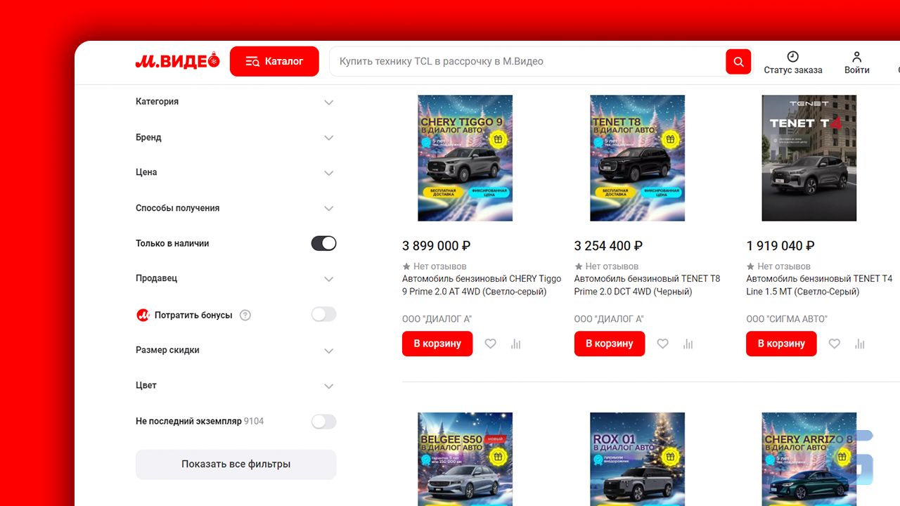 На старте доступны бренды TENET, Chery, Omoda, Belgee, Geely и Rox, ориентированные на массовый сегмент. Цены варьируются от 1 890 000 до 7 700 000 рублей.