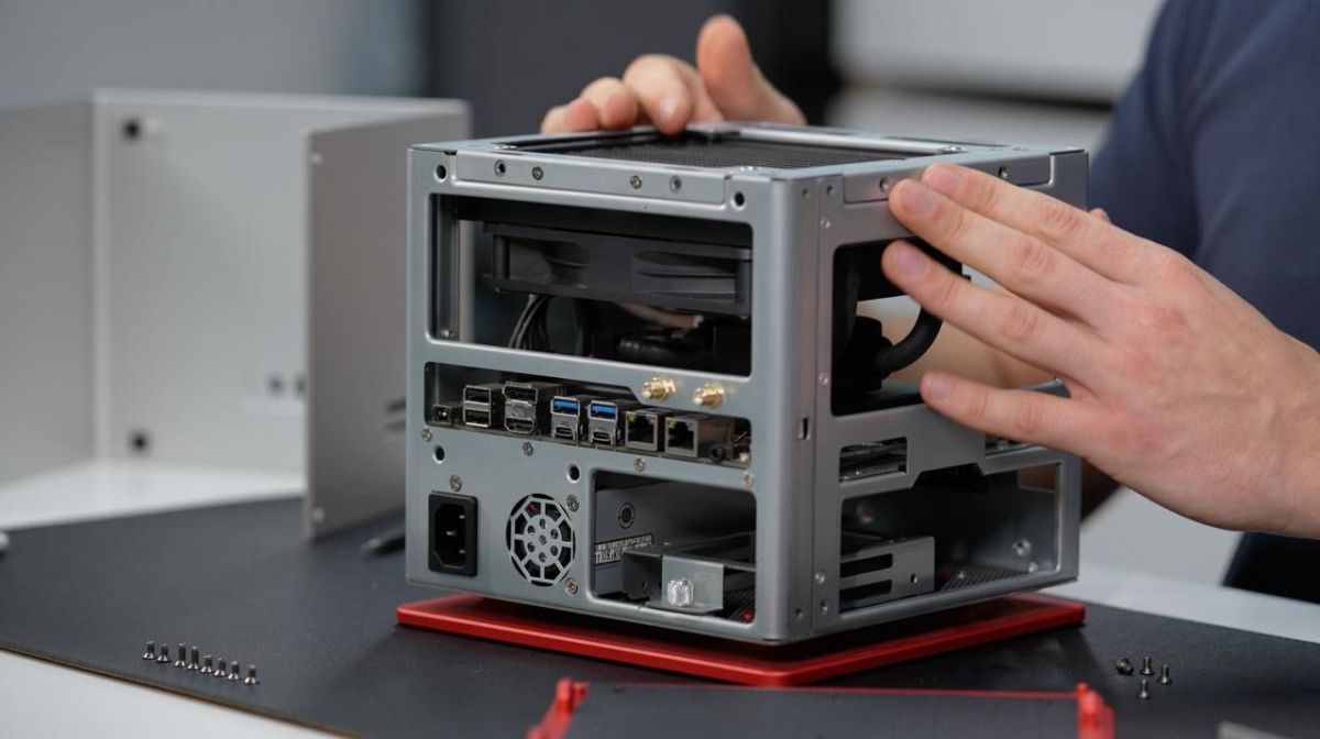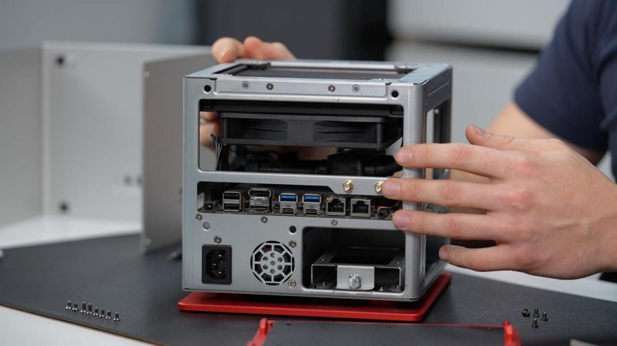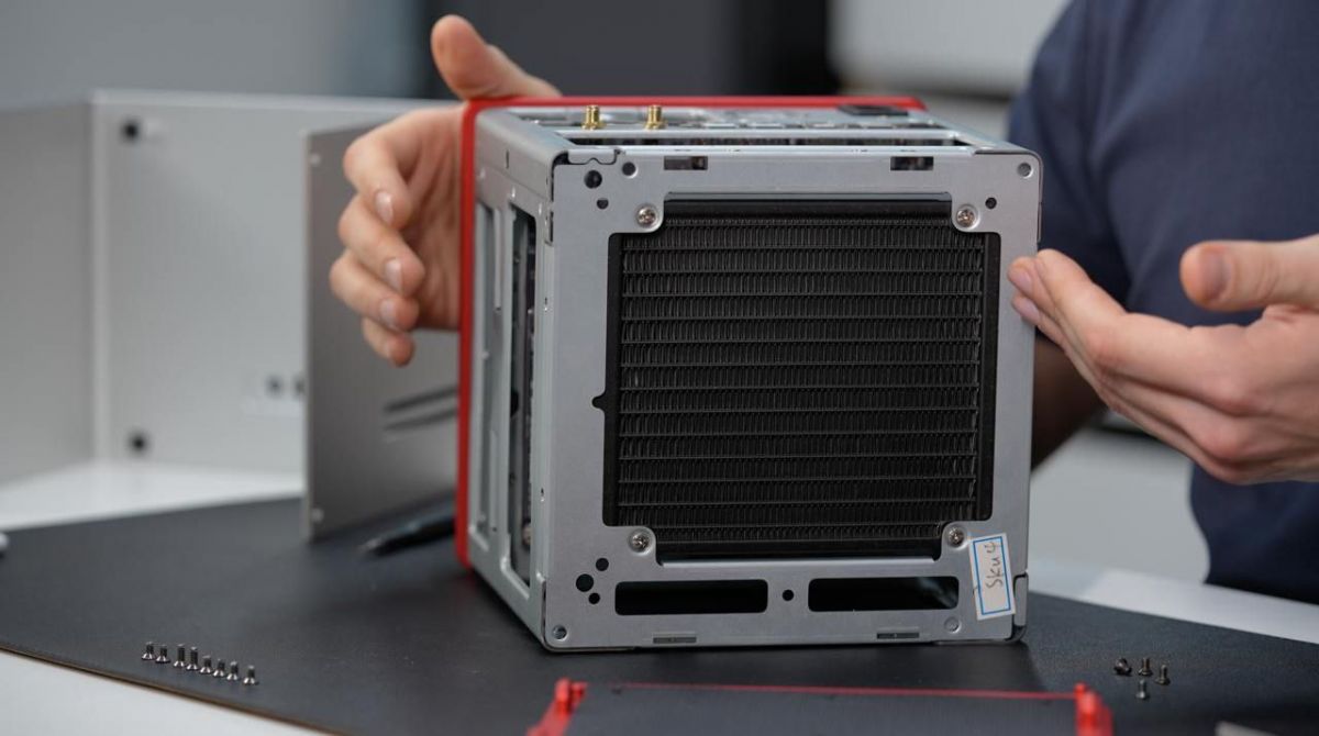 Корпус рабочей станции выполнен из цельнолитого алюминиевого сплава и окрашен в серебристый цвет. Он устойчив к повреждениям и хорошо отводит тепло. Устройство имеет кубическую форму с габаритами около 20 сантиметров с каждой стороны.