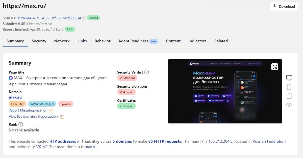 Согласно данным Cloudflare Radar, по результатам проверок URL сервис в 9 из 10 случаев был отнесен к категории вредоносного ПО. При этом у MAX сохраняется действующий TLS-сертификат, который подтверждает подлинность ресурса.