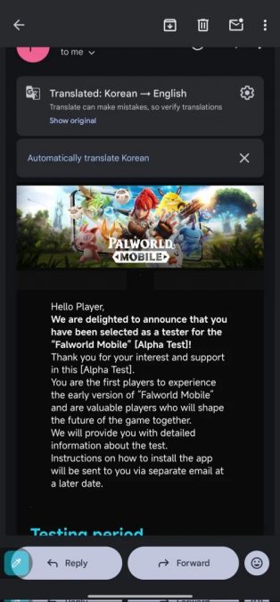 Южнокорейская компания KRAFTON начала рассылать письма с приглашениями на закрытый альфа-тест Palworld Mobile. Соответствующий скриншот сообщения появился в сети.