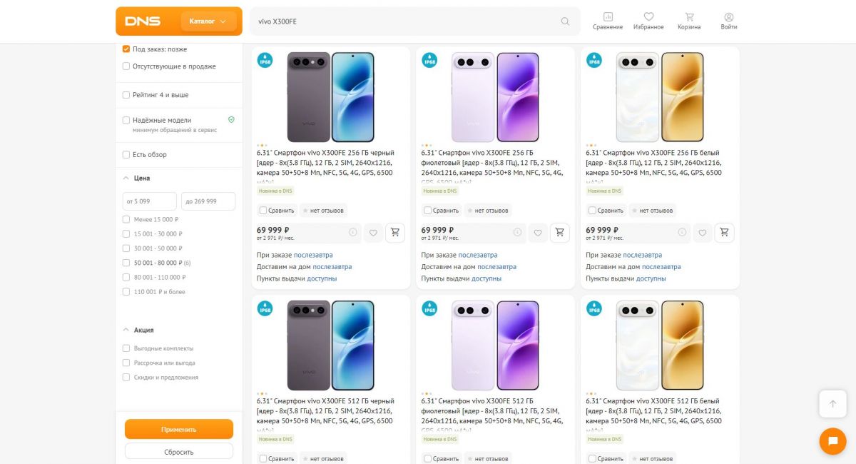 - Vivo X300 FE (12/256 ГБ) — 69 999 рублей;