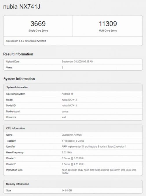 Флагманский смартфон Nubia Z80 Ultra протестировали в Geekbench с новым процессором Qualcomm Snapdragon 8 Elite Gen 5 и 16 ГБ оперативной памяти.