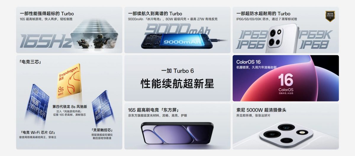 Базовый OnePlus Turbo 6 оснащён 6,78-дюймовым AMOLED-дисплеем с разрешением 2772×1242 пикселя, частотой обновления до 165 Гц и пиковой яркостью до 1800 нит. В качестве аппаратной платформы используется чипсет Snapdragon 8s Gen 4. Смартфон предлагается в конфигурациях с 12/16 ГБ оперативной памяти LPDDR5X и накопителем на 256/512 ГБ стандарта UFS 4.1.