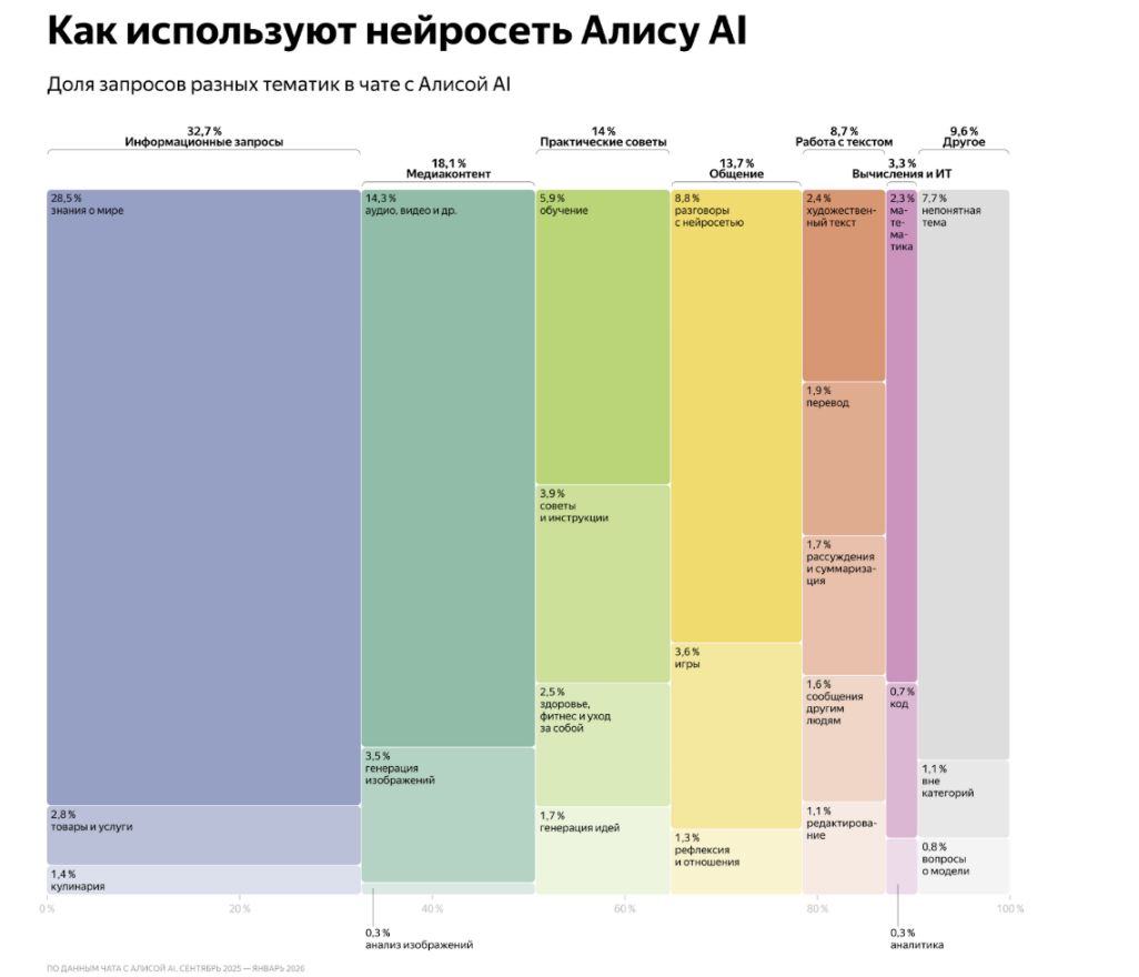 Исследование охватывает период с сентября 2025 по январь 2026 года. За этот год аудитория чата с Алисой AI выросла в семь раз — до 30,5 миллиона авторизованных пользователей в месяц.