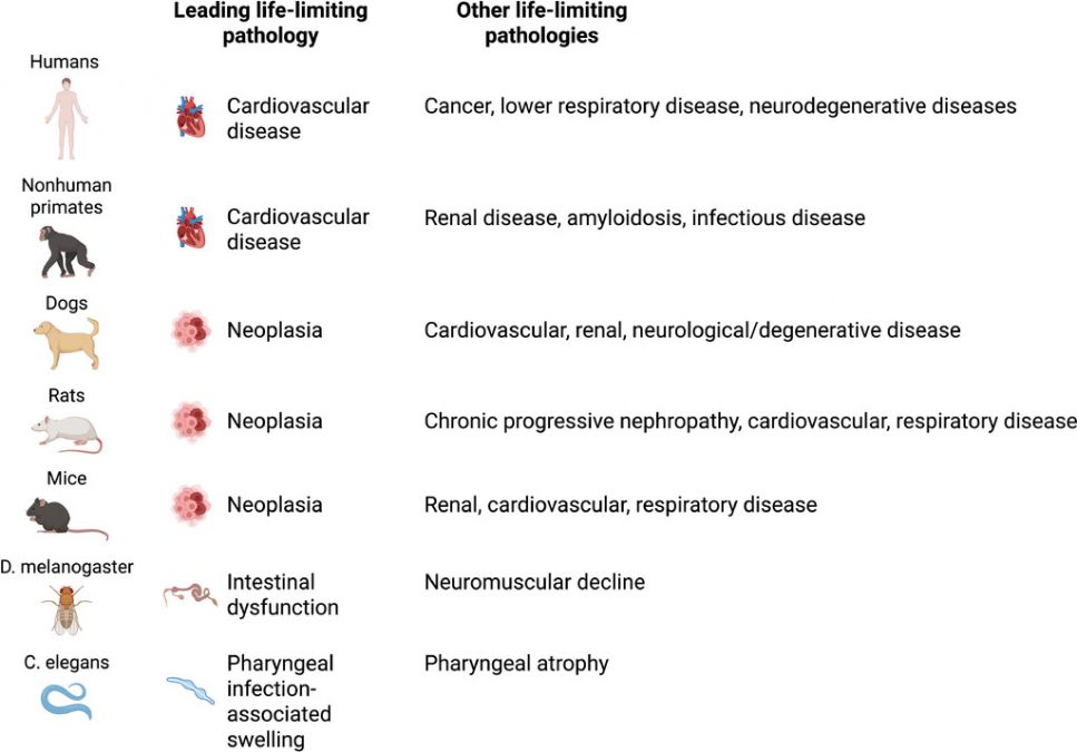 Аналогичная картина наблюдается и у животных, но с разными уязвимыми системами. Мыши и крысы чаще всего погибают из-за онкологических заболеваний. У плодовых мушек основной причиной становится разрушение кишечного барьера. У червей — потеря способности к глотанию. Старение повышает вероятность сбоя, но не выступает прямым «механизмом отключения».