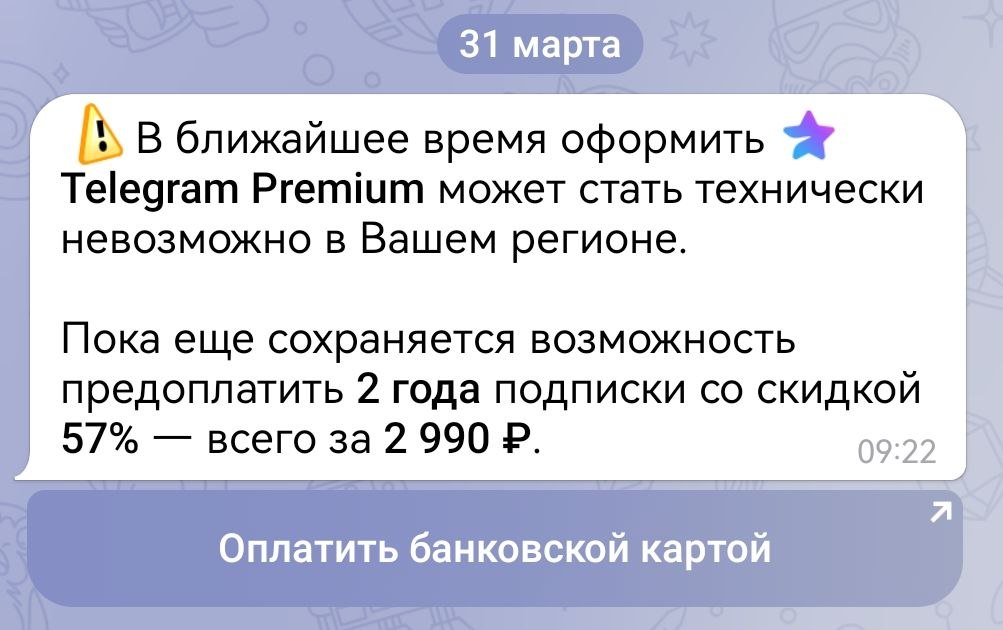 В сообщениях говорится, что сейчас у пользователей есть «последняя возможность» оплатить подписку. Одновременно мессенджер предлагает оформить Premium сразу на один или два года со скидкой.