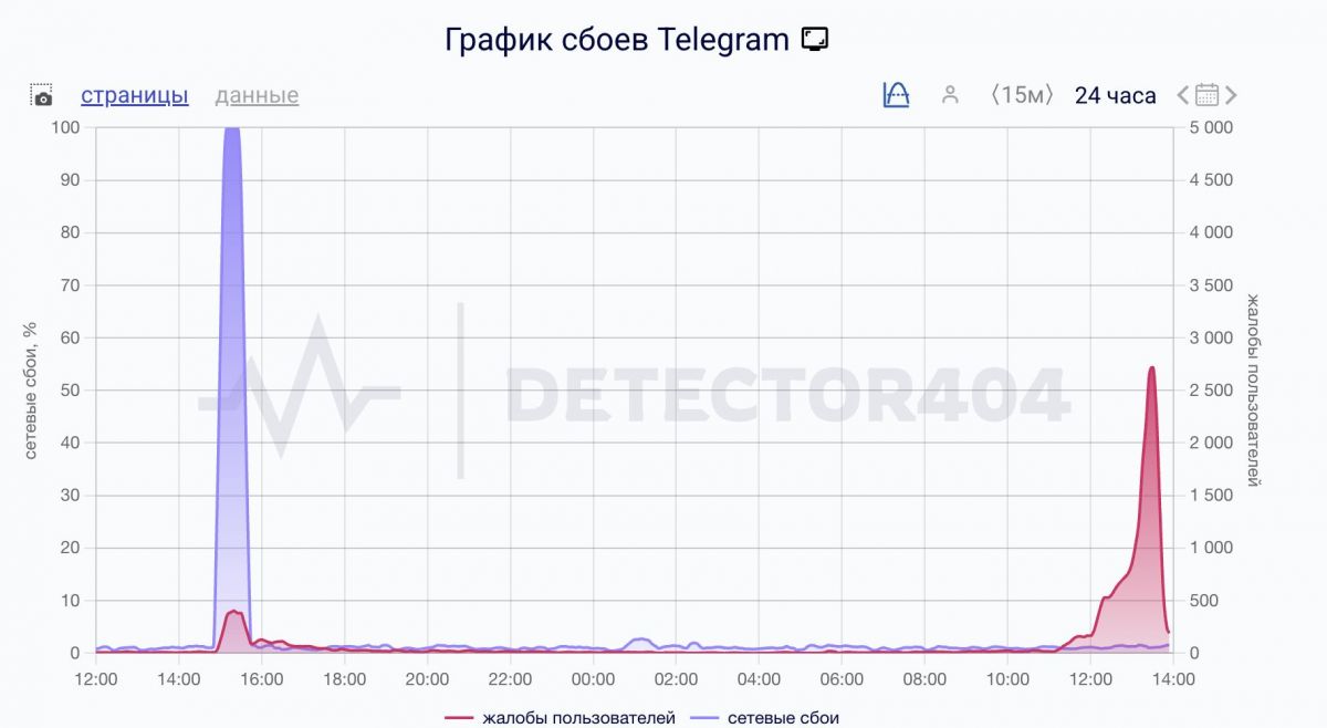 Пользователи Telegram снова пожаловались на проблемы в работе мессенджера. По данным сервиса Downdetector на 13:37 по московскому времени 12 марта 2026 года, за последний час поступило более 6000 сообщений о сбоях, а за сутки — около 10,4 тысячи.