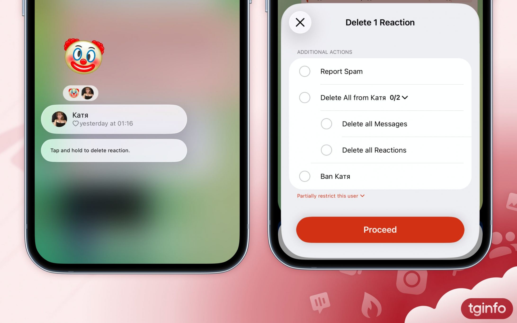 Первое нововведение связано с реакциями. При долгом нажатии на реакцию под сообщением Telegram предложит заблокировать пользователя, а также удалить все его сообщения и реакции в чате. Такая функция должна помочь бороться со спам-ботами, которые массово оставляют реакции под публикациями.