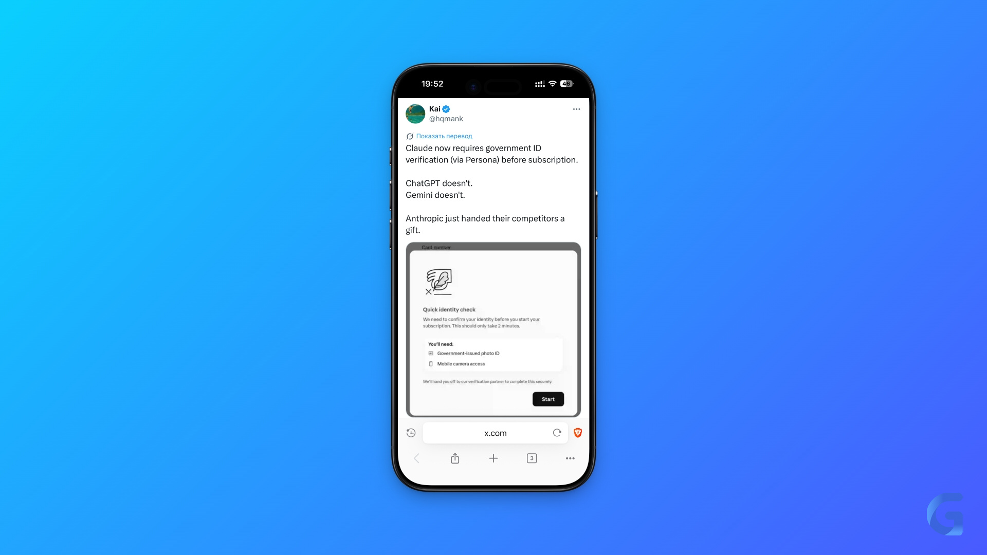 Anthropic начала вводить дополнительную проверку личности для пользователей Claude. Речь идёт не о стандартном входе в сервис, а о некоторых функциях и сценариях использования, детали которых компания публично не раскрывает. Первые пользователи уже начали получать запросы на верификацию прямо во время работы с ботом.