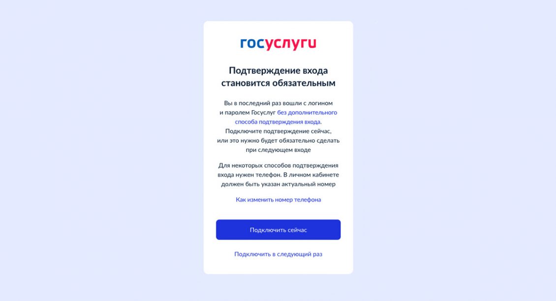 Пользователи, которые по каким-либо причинам не настроили двухфакторную аутентификацию, имеют возможность войти в свой аккаунт единожды, используя обычный логин и пароль. Однако, при следующей попытке входа, портал предоставит уведомление, требуя выбрать дополнительный метод входа.