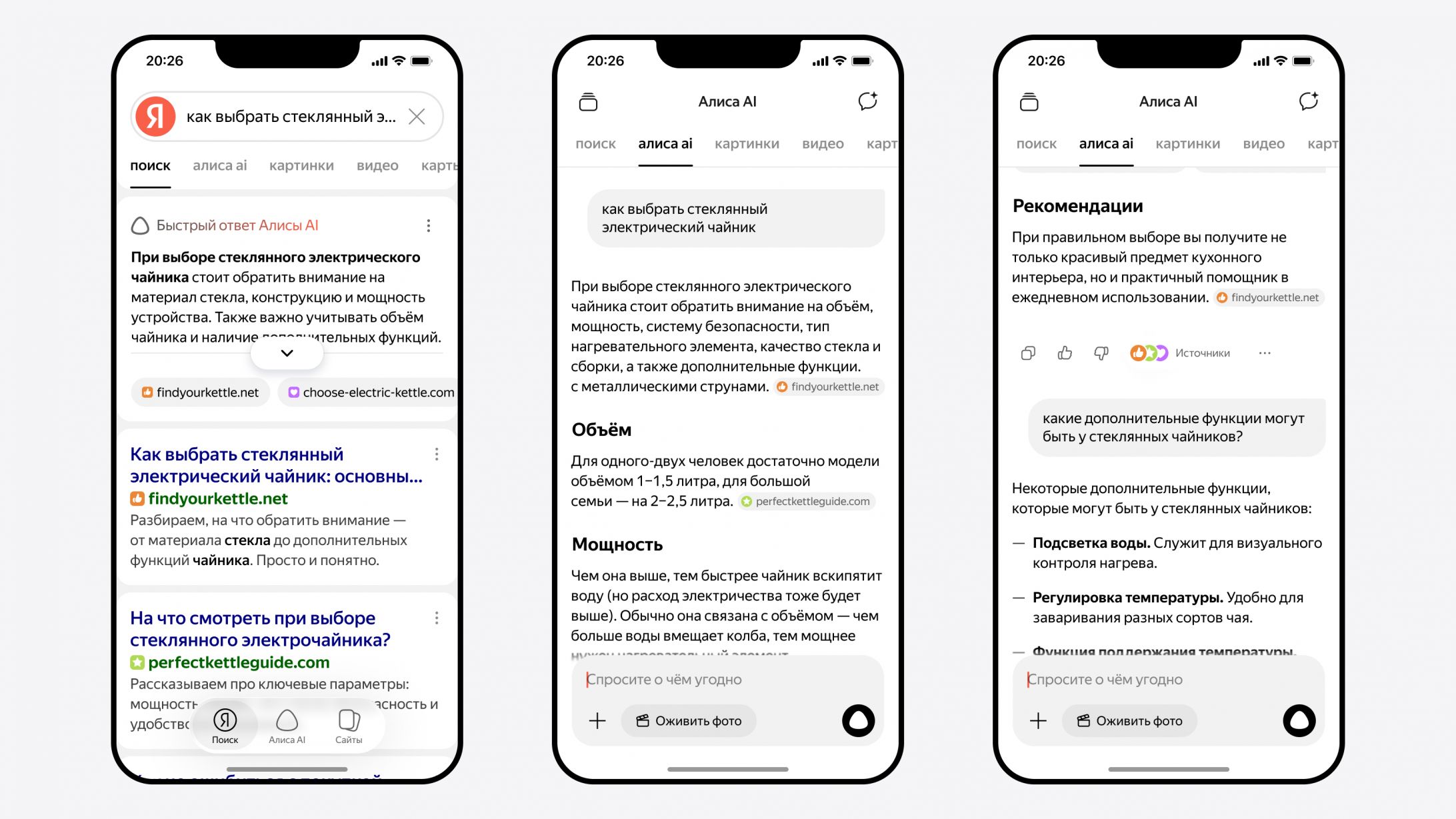 В Поиске Яндекса появился диалоговый режим с Алисой AI. Новая функция позволяет вести полноценный разговор с нейросетью и одновременно пользоваться привычными инструментами поиска, включая ссылки, изображения, товары и видео.