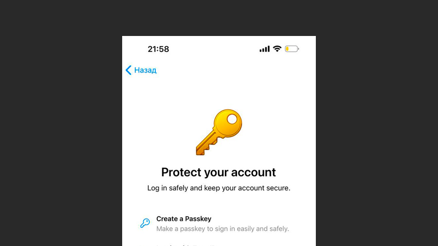 В свежем обновлении Telegram 12.2.2 появилась функция, которую многие ждали уже пару лет: вход по ключам из менеджеров паролей. Это значит, что теперь можно авторизоваться в мессенджере через Face ID или отпечаток пальца, как в современных банковских приложениях.
