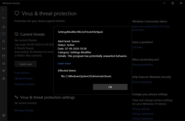 Суть в том, что ранее передачу телеметрии можно было легко заблокировать правкой файла hosts. Ранее это никак не отражалось на действиях ОС, но теперь Microsoft Defender начал отмечать внесённые правки как вирусную атаку HostsFileHijack.