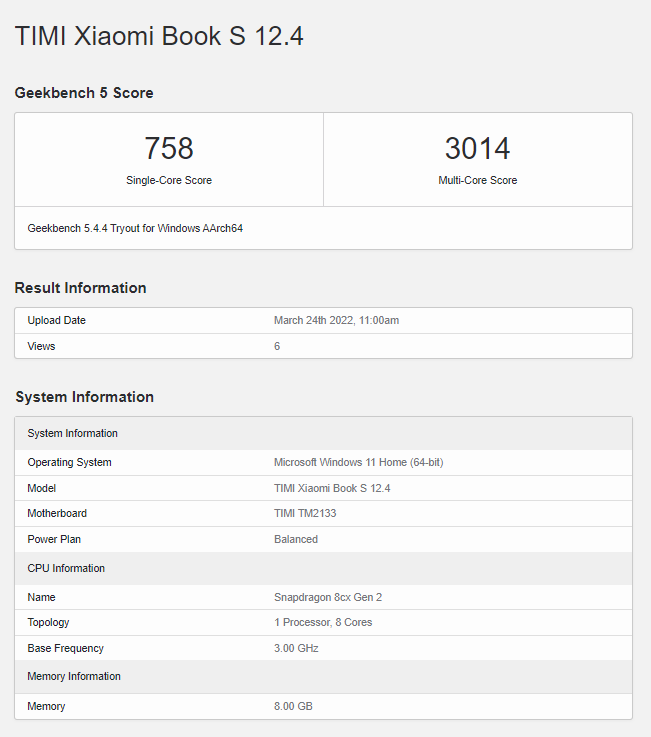 Из данных становится ясно, что устройство получит однокристальный процессор Qualcomm Snapdragon 8cx Gen 2, который работает на частоте 3,00 ГГц. Также у ноутбука будет 8 Гб оперативной памяти и 64-битная версия Windows 11 Home.