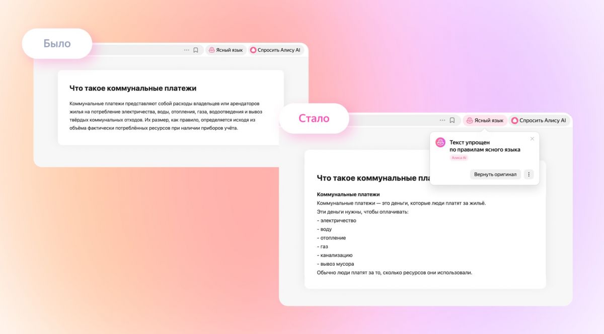 Яндекс Браузер первым в мире запустил функцию на базе Алисы AI, позволяющую адаптировать материалы в интернете под так называемый «ясный язык». Она направлена на упрощение информации для людей с особенностями восприятия.