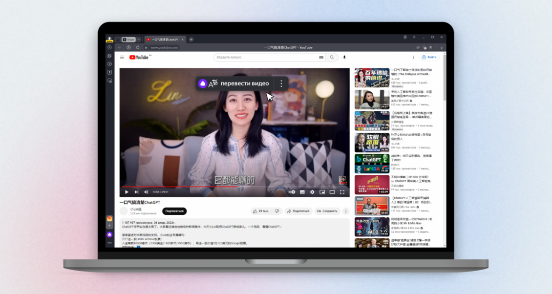 Яндекс Браузер предлагает перевести видео с китайского языка на YouTube с помощью одной кнопки «Перевести видео».