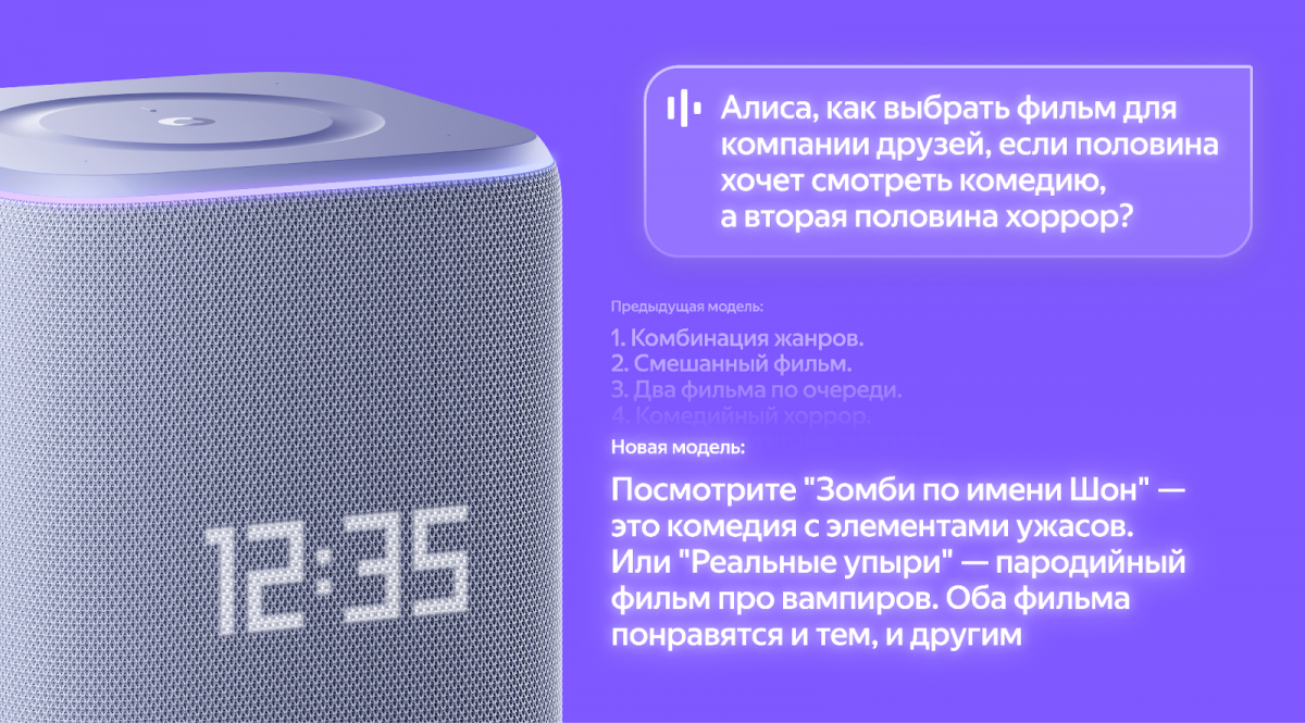 Обновлённая модель также лучше удерживает контекст разговора и учитывает больше условий в запросах. Например, Алиса может предложить фильмы для семейного просмотра с учётом предпочтений всех участников.