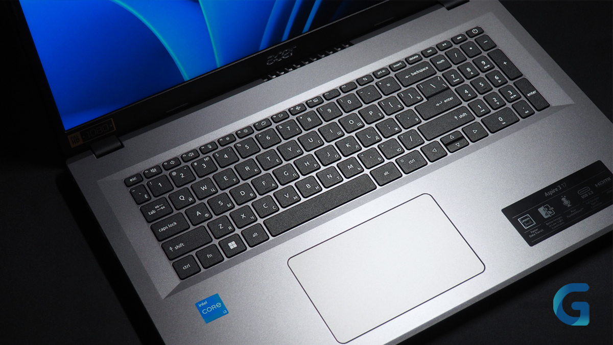 Клавиатура имеет цифровой блок — плюс для тех, кто часто работает с таблицами. Ход клавиш хороший, есть четкая тактильная отдача. Единственный дискомфорт вызывают уменьшенные стрелки (вверх и вниз) — попадать по ним не всегда получается. В остальном же положение кнопок стандартное, поэтому «переехать» на Aspire 3 17 не составит труда.