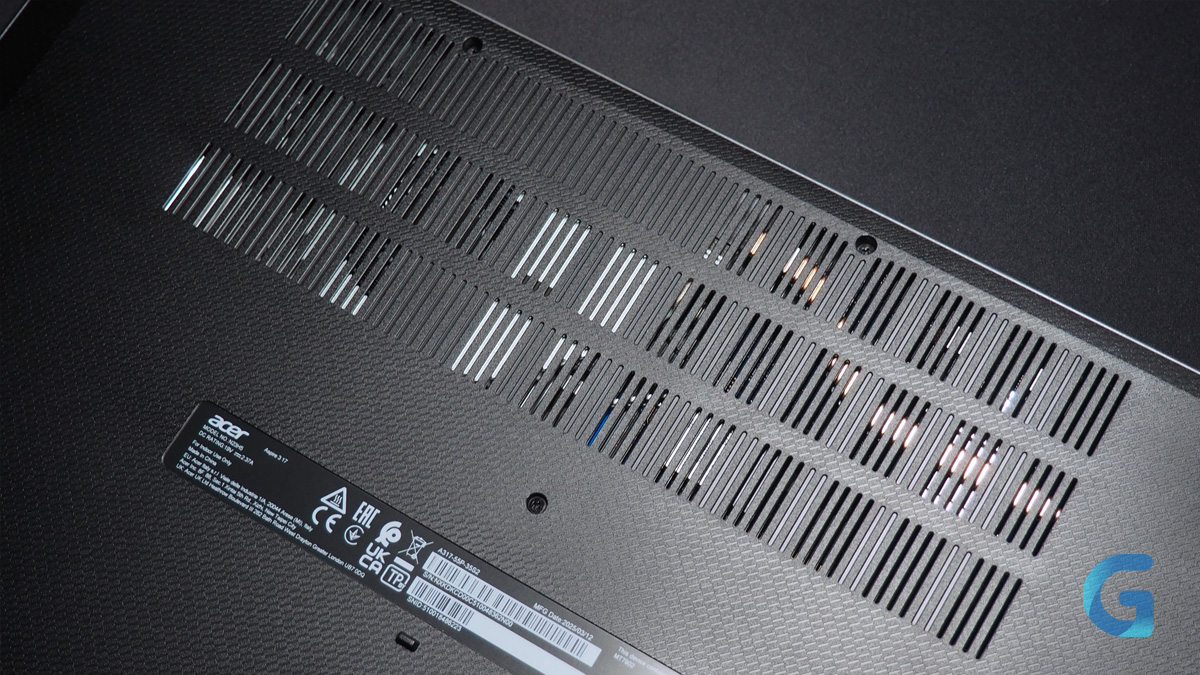 Задняя панель ноутбука состоит их переработанного пластика и имеет слегка ребристую фактуру. На дне расположились вентиляционная решетка, отверстия динамиков и четыре резиновые ножки. Там же справа спрятана маленькая кнопка для сброса аккумулятора — редкая, но полезная деталь.