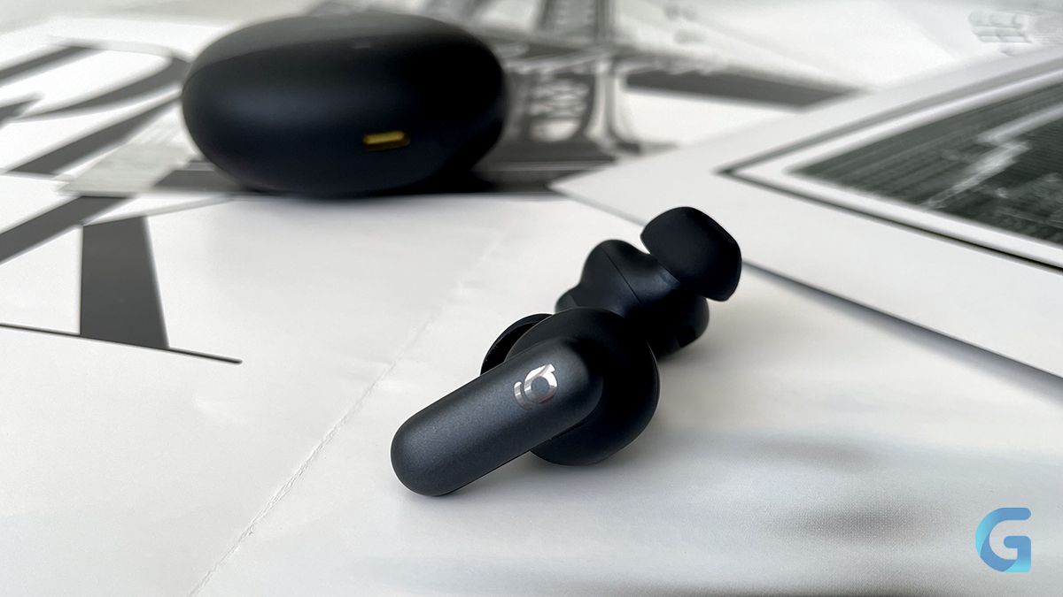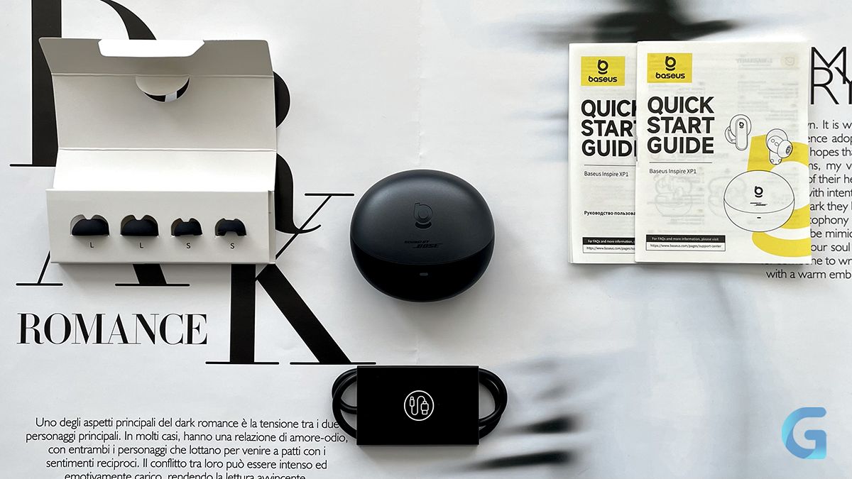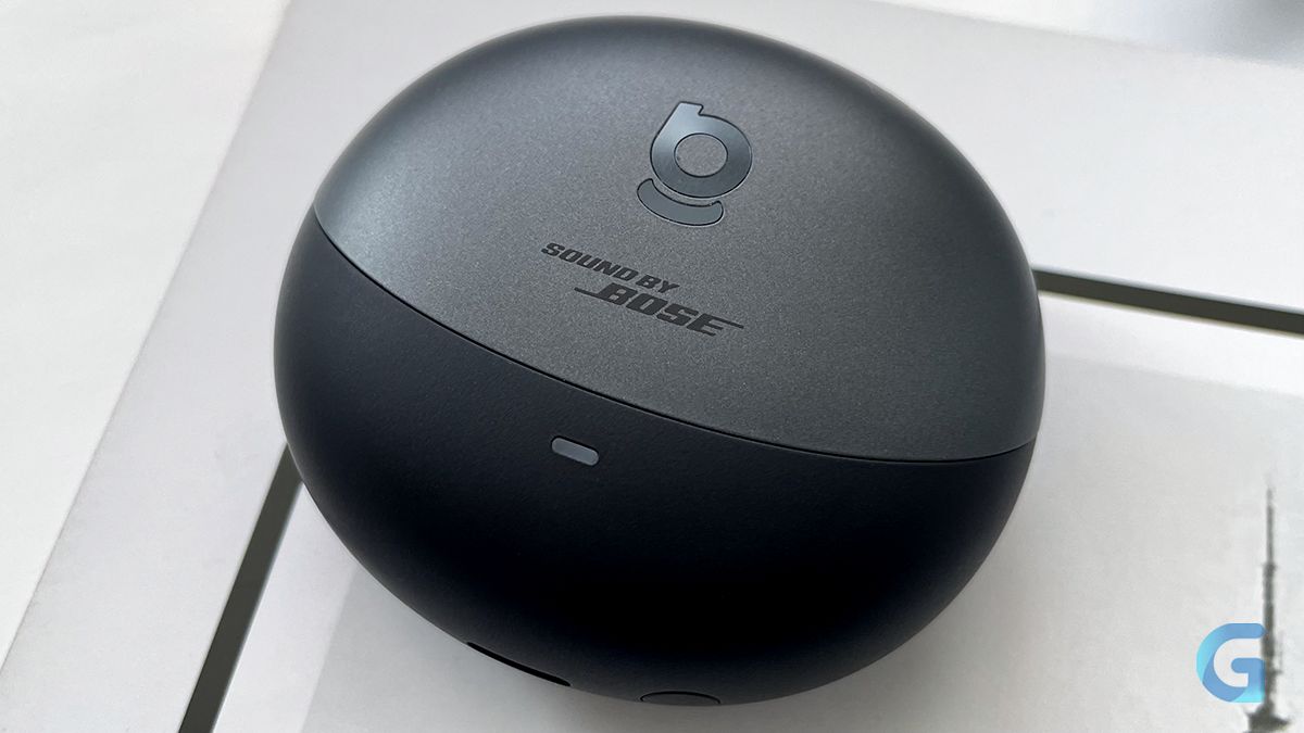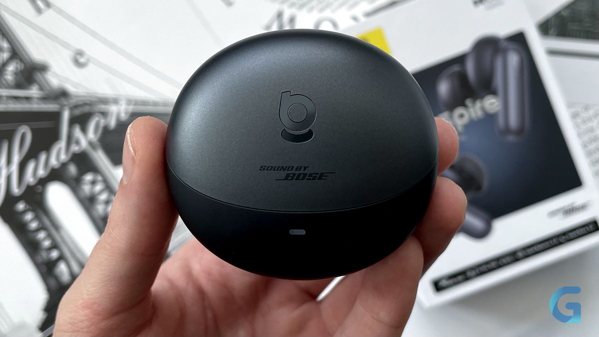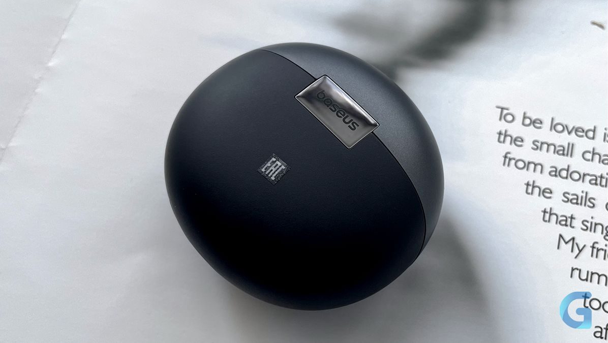 Футляр выполнен в тех же цветах, что и наушники. Крышка — тёмно-серая с логотипами Baseus и «Sound by Bose», а основной корпус — чёрный с небольшим световым индикатором заряда, разъёмом USB-C и кнопкой ручного сопряжения/сброса до заводских настроек.