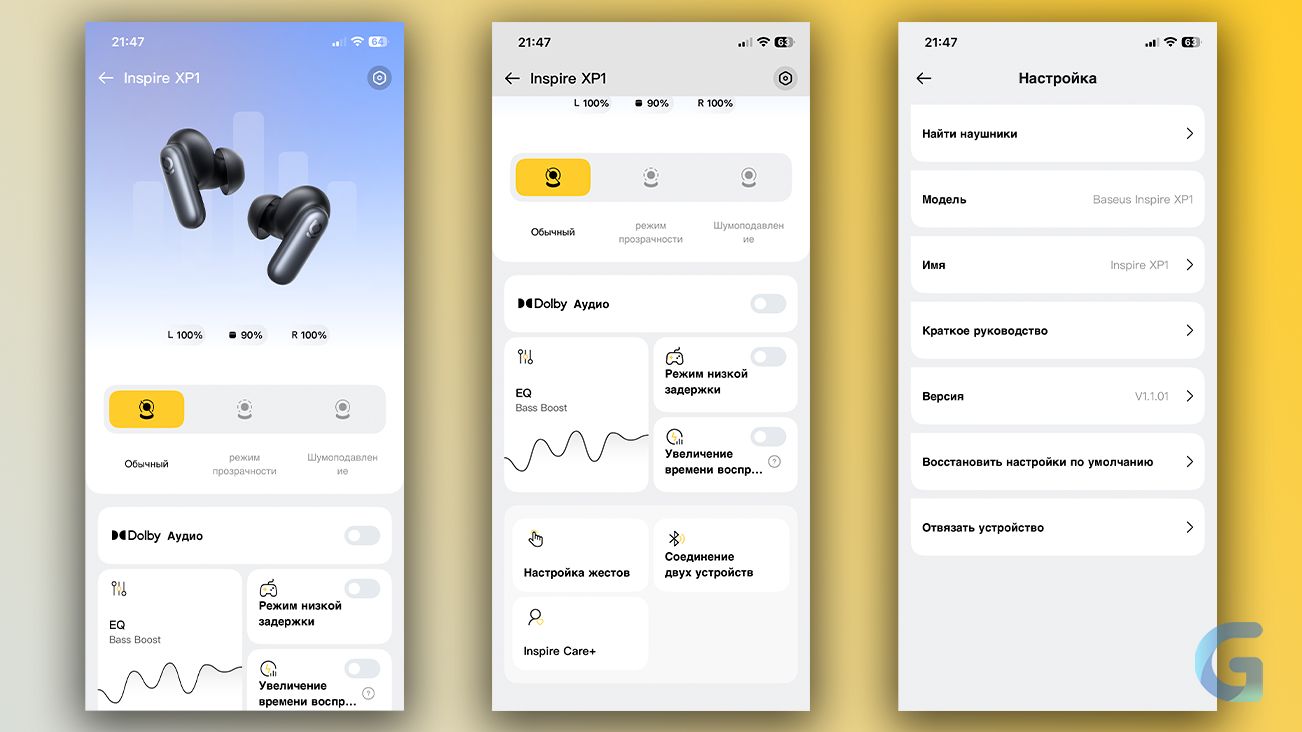 Однако, если всё-таки хочется более тонко настроить устройство под себя, нужно скачать фирменное приложение «Baseus» (Google Play / App Store). Через него можно обновлять прошивку, активировать Dolby Audio или режим низкой задержки, менять пресеты или настроить эквалайзер самостоятельно.