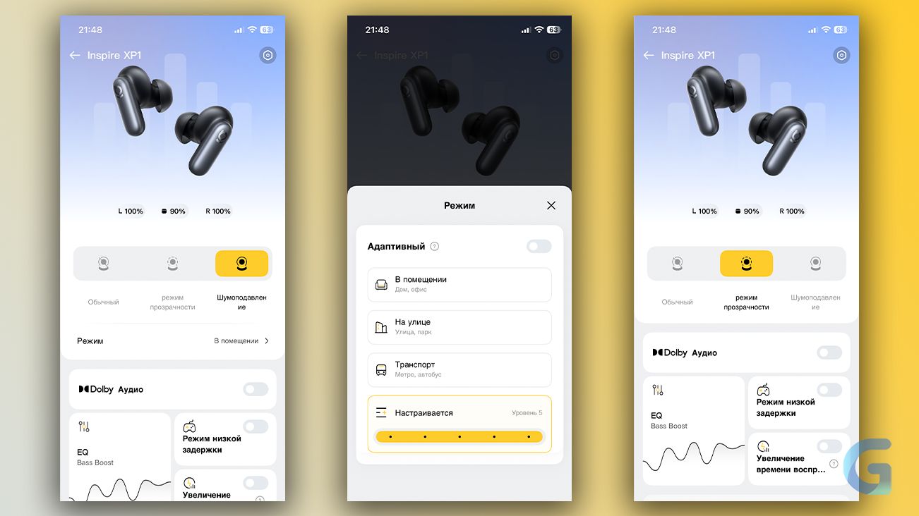 Лично я практически не использую шумоподавление, так как ощущение полной тишины и «вакуума» вызывает дискомфорт. Но в Inspire XP1 мне больше понравился «Адаптивный режим». Он не такой «грубый», как шумодав 5 уровня, но в то же время отлично гасит звуки вокруг.
