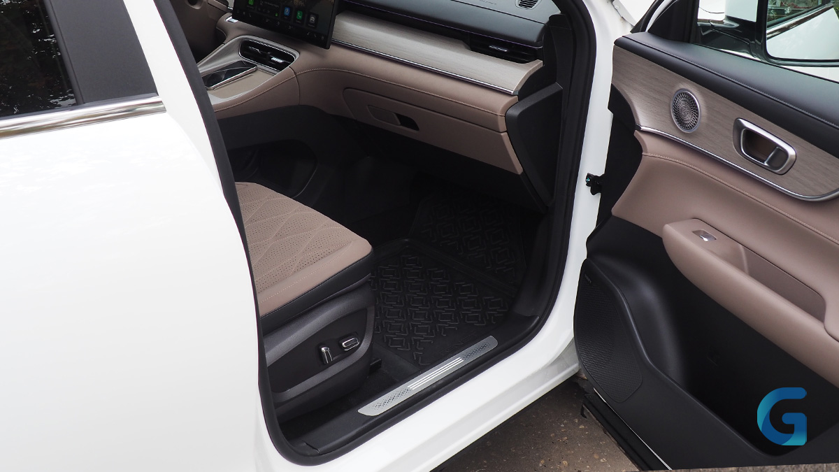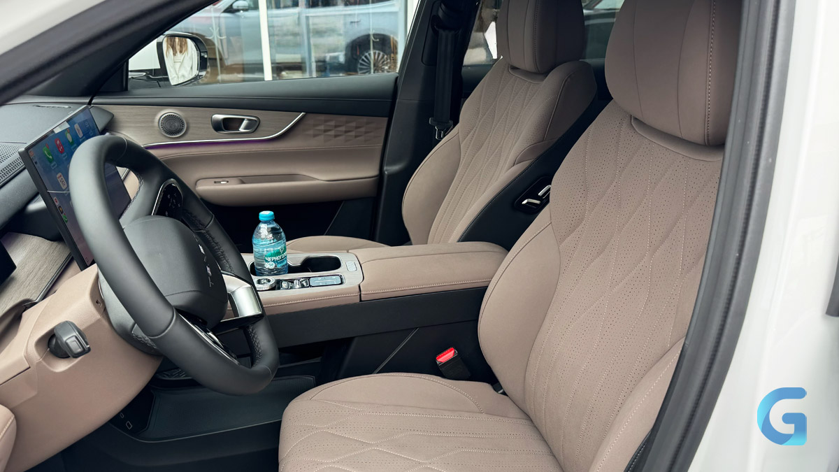 Кресла имеют многослойную конструкцию: верхний слой — мягкая подушка около двух сантиметров толщиной, ниже — более плотная основа с поддержкой спины. Водитель может точно настроить посадку при помощи боковых переключателей — изменить высоту, наклон и поясничный упор. Пассажиру доступна электрорегулировка, но без отдельной настройки поясницы.