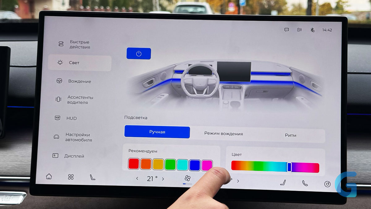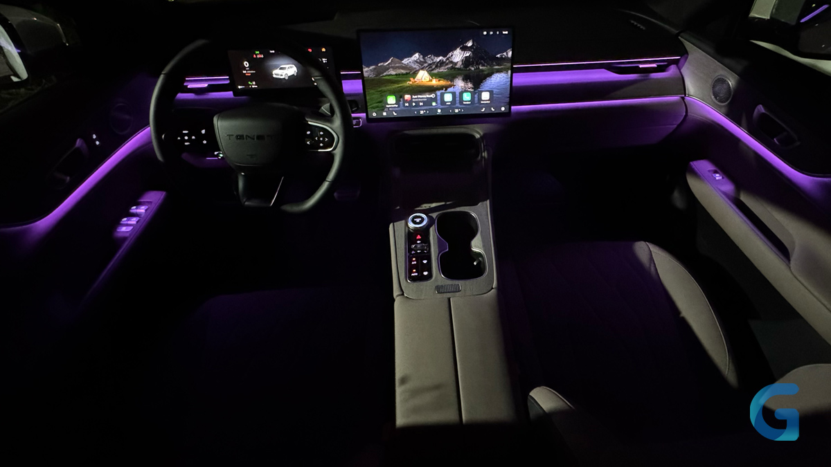 Особенно приятен T8 ночью. Мягкая подсветка в салоне создаёт спокойную атмосферу — свет не режет глаза, но и не теряется. Цвет и интенсивность света можно менять — от холодного до тёплого тона, а при желании подсветка «подыгрывает» музыке. Правда, без излишеств: эффектных RGB-анимаций здесь нет, и, возможно, даже к лучшему — салон остаётся спокойным и собранным.
