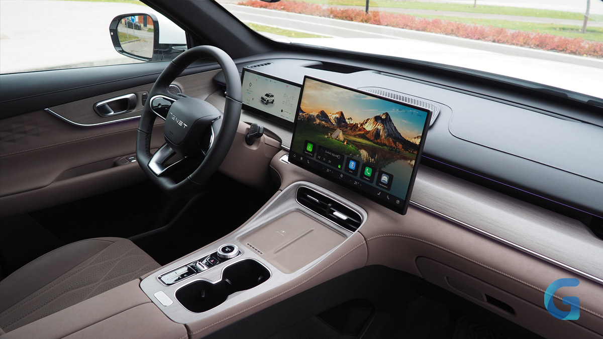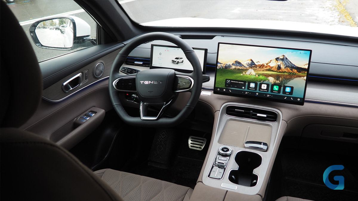 В салоне TENET T8 всё сделано по принципу «удобно, а не показно». Материалы подобраны без претензий на люкс, но на ощупь приятные. Деревянные вставки пластиковые, но все сделано крепко, ничего не скрипит и не люфтит.