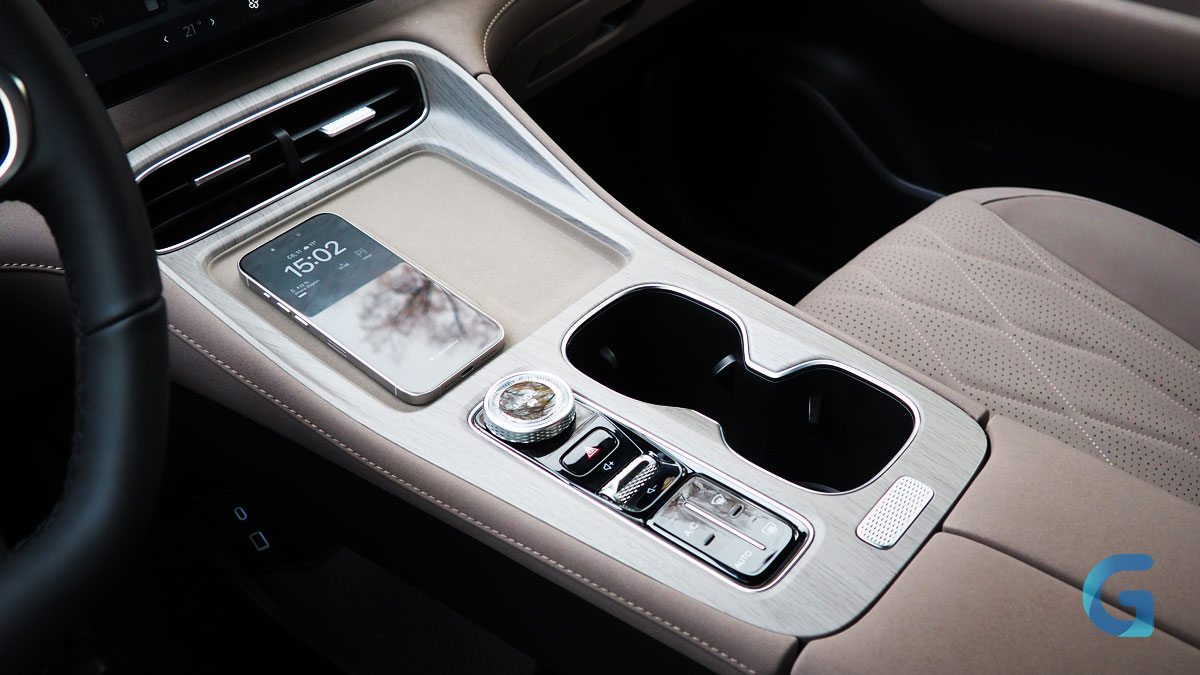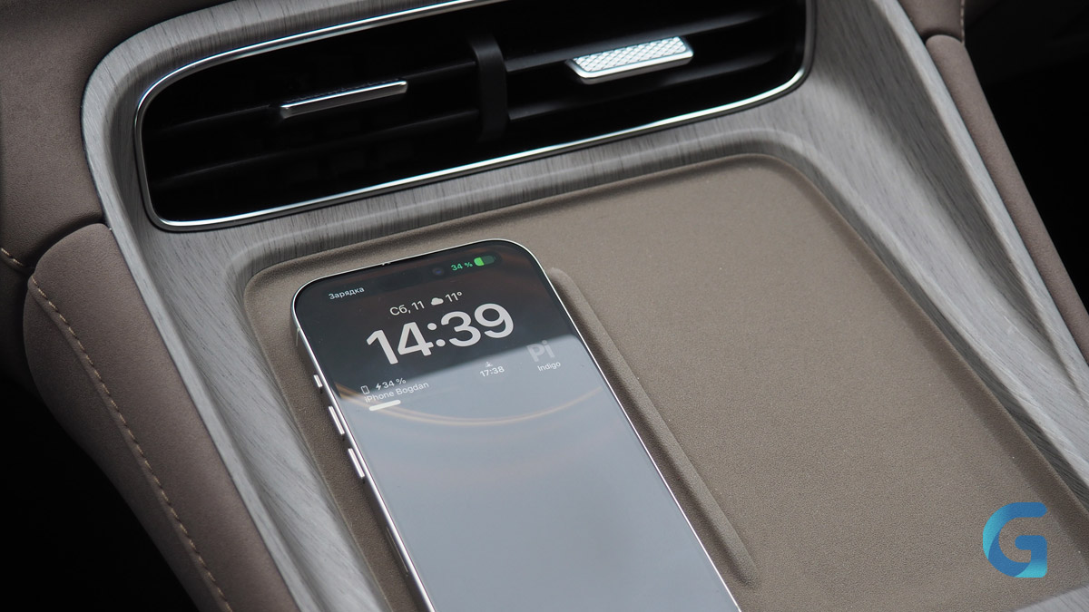 Разъёмов в салоне хватает — по USB-A и USB-C спереди и сзади. Для телефонов есть отдельная ниша с мягкой подложкой, левая площадка поддерживает быструю беспроводную зарядку 50 Вт с активным охлаждением. Bluetooth соединяется без проблем, кириллица в контактах отображается корректно.