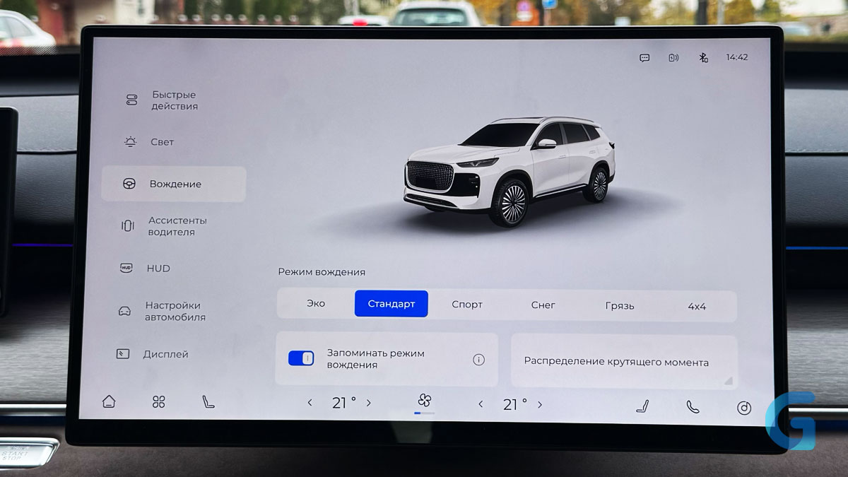 Весь путь я чередовал режимы между «Стандартом» и «Спортом». В итоге именно стандартный оказался наиболее сбалансированным: реакции естественные, без рывков, машина предсказуемая. В «Спорте» ускорение становится чуть острее, но при резком нажатии на педаль газа всё равно есть лёгкая пауза — коробка словно на долю секунды думает, прежде чем включить нужную передачу.