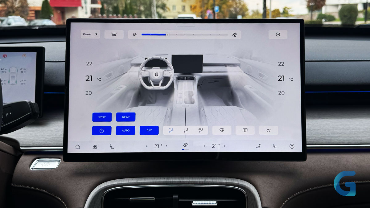 Климат-контроль двухзонный, управляется через большой экран медиасистемы. Панель сенсорная, но отзывчивая — к ней быстро привыкаешь. Система работает стабильно, не требует постоянных корректировок, хотя есть нюанс: привычные 22° здесь ощущаются жарче, чем в других машинах, комфортнее выставлять около 20°. Для задних пассажиров выведены отдельные воздуховоды с регулировкой направления потока, а кнопки включения подогрева сделаны сенсорными.