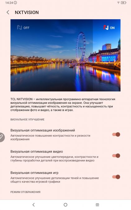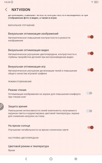 Отдельно стоит упомянуть раздел NXTVision, который можно найти в «Настройках». Представляет собой интеллектуальную программно-аппаратную технология визуальной оптимизации изображения на экране. Она улучшает детализацию, повышает четкость, контрастность и насыщенность при отображении фото и видео, а также в играх. В общем, экран можно максимально настроить под себя.